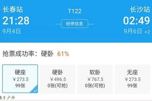 火车 去程:长春21.28开T122次 第三天2.49 到长沙,卧铺496.5